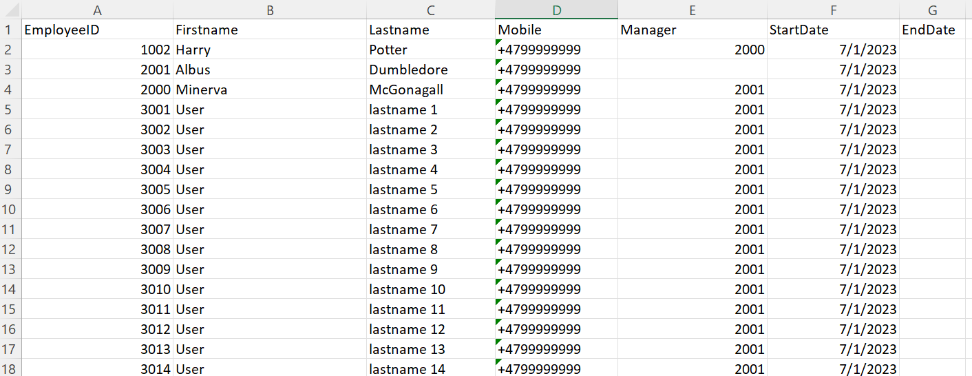 HR systems vary a lot, so I started on a little Hogwarts teamed HR-system in Excel, just to model a few employees, then gave up and just called users incremental numbers…: