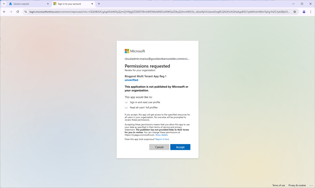 After accepting, ignore the error message AADSTS500113: No reply address is registered for the application. This is normal for this type of application.