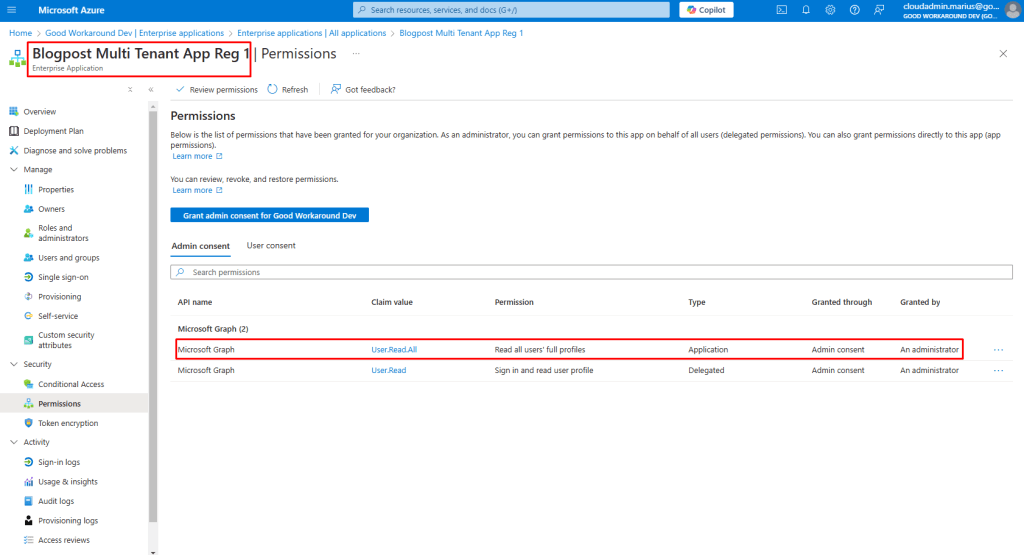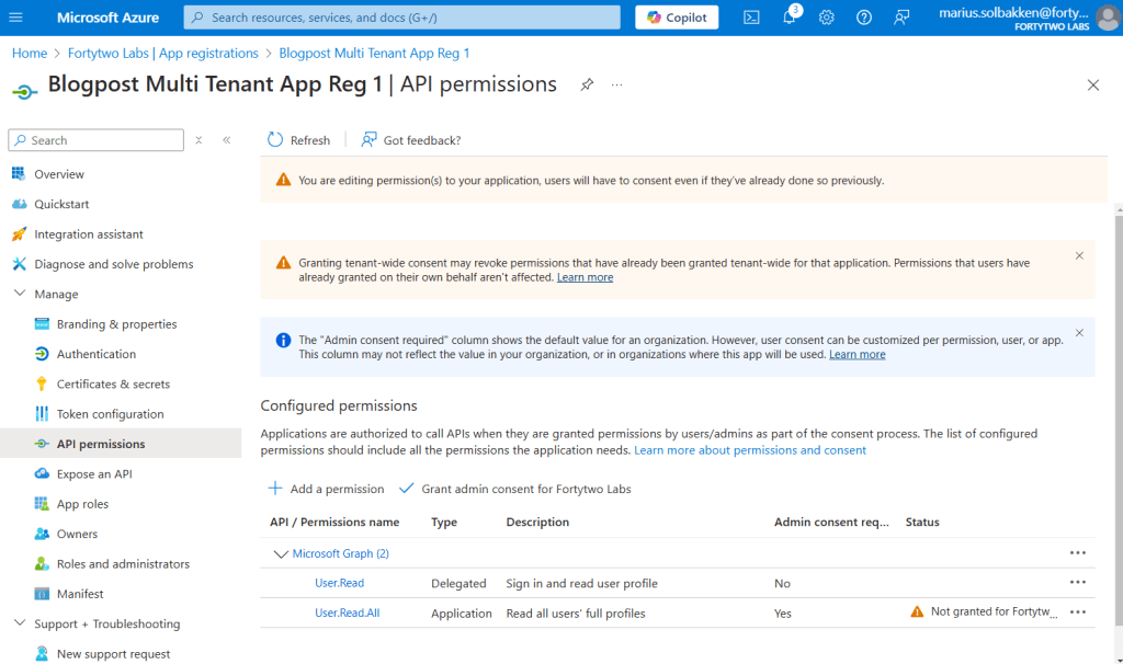 • Tenant B has consented to the app registration (we will be using the user.read.all scope)