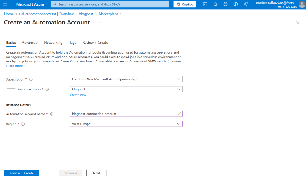 During the creation process of the automation account, we specify the user assigned identity we created under the Advanced tab: