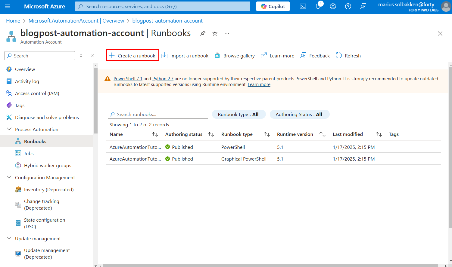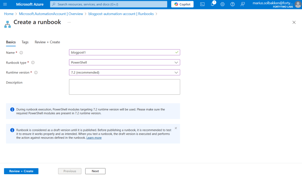 After creating the automation account, let’s create a runbook using PowerShell 7.2: