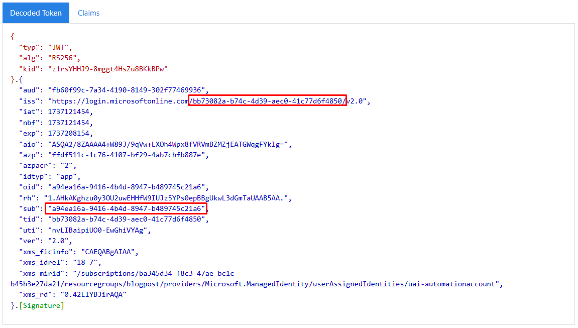 If we create it down a bit more in detail, on the access token level, we can see that the access token that we receive in step 2 is issued with the subject field set to the object id of the user assigned identity, and signed by tenant A: