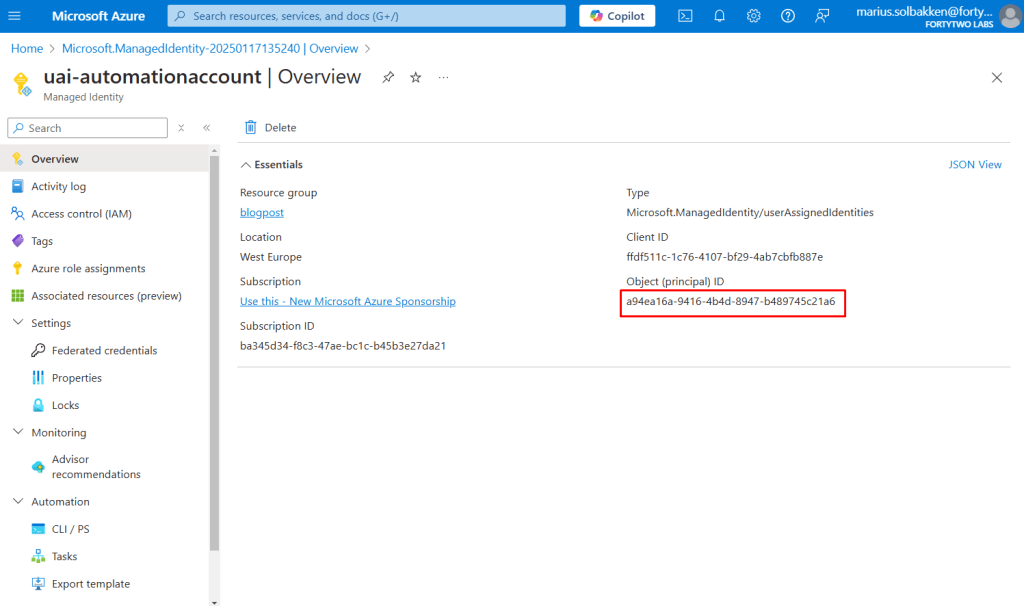 We have now created all required resources except for the automation account that will be using the identity. You could also use a virtual machine, logic app, function app, web site or any other service that supports managed service identities for this purpose.