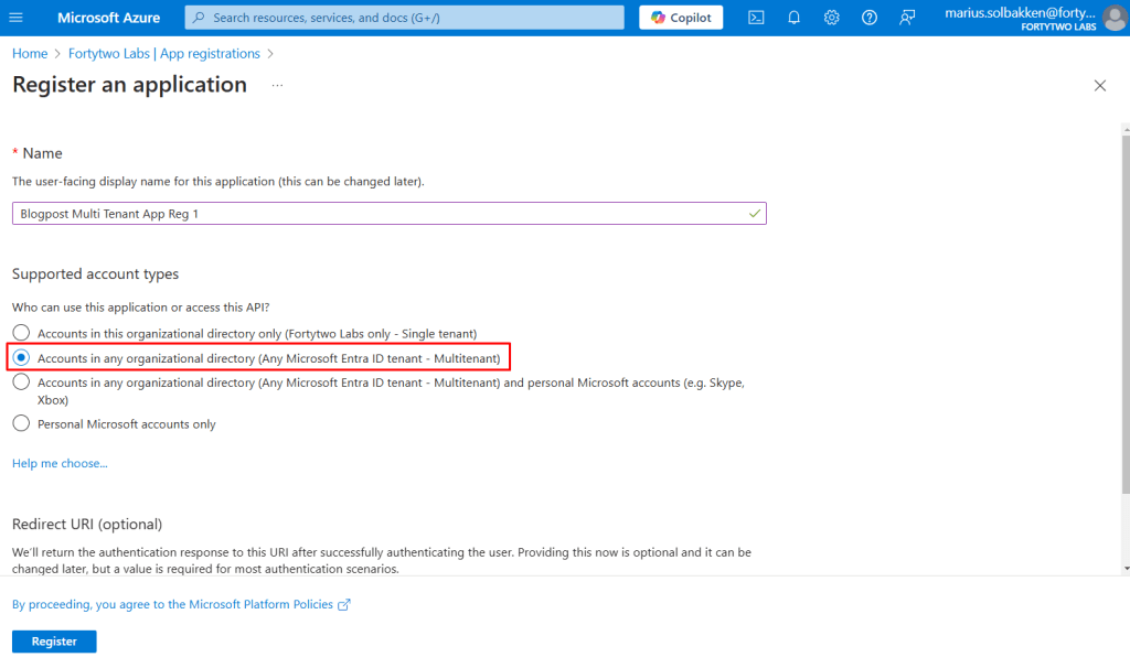 Give it a proper name and select Accounts in any organizational directory (Any Microsoft Entra ID tenant – Multitenant). We do not need any redirect uris.