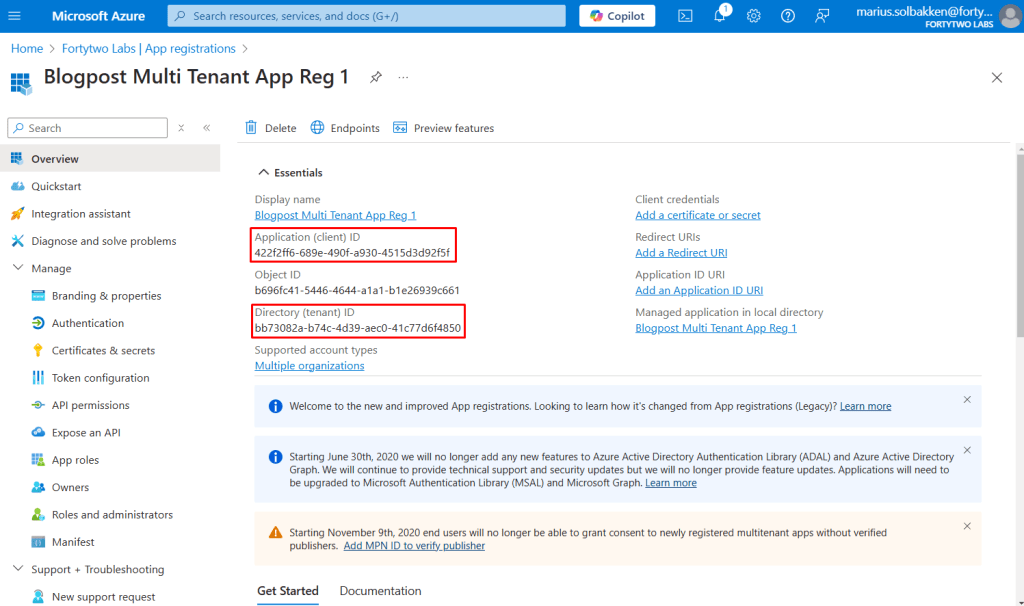 Note down the tenant id and the client id of the created app registration: