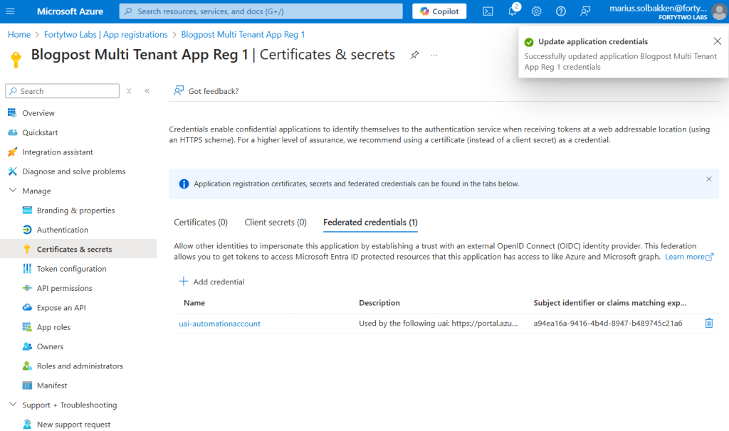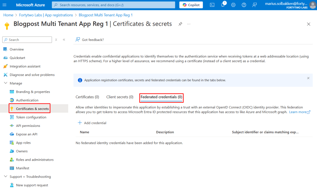 There is a little caveat though, and that is that you will still need another app registration, but by using this new preview, we no longer need client secrets or certificates. Let’s have a look at how this works!
