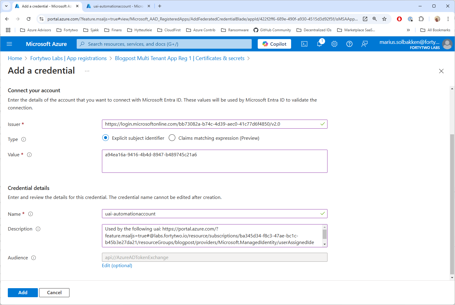 This matches the federated credential that we added to the app registration: