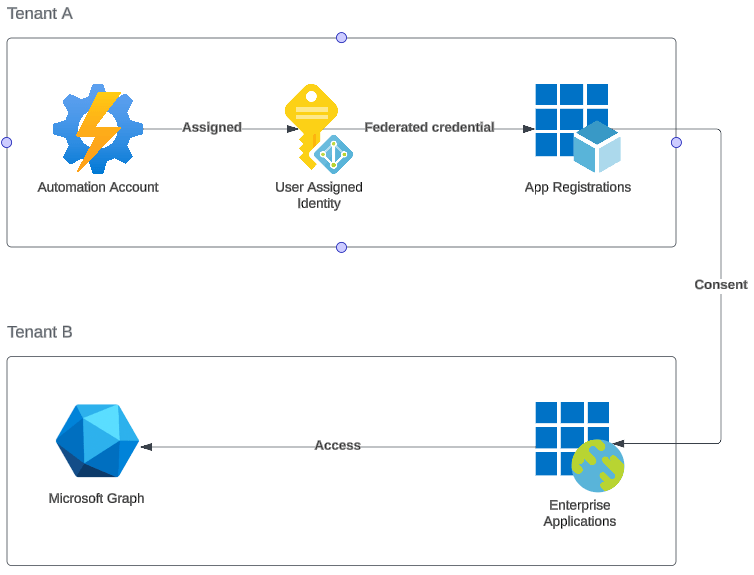• The user assigned identity is used as a federated credential to a multi tenant app registration (still in tenant A)